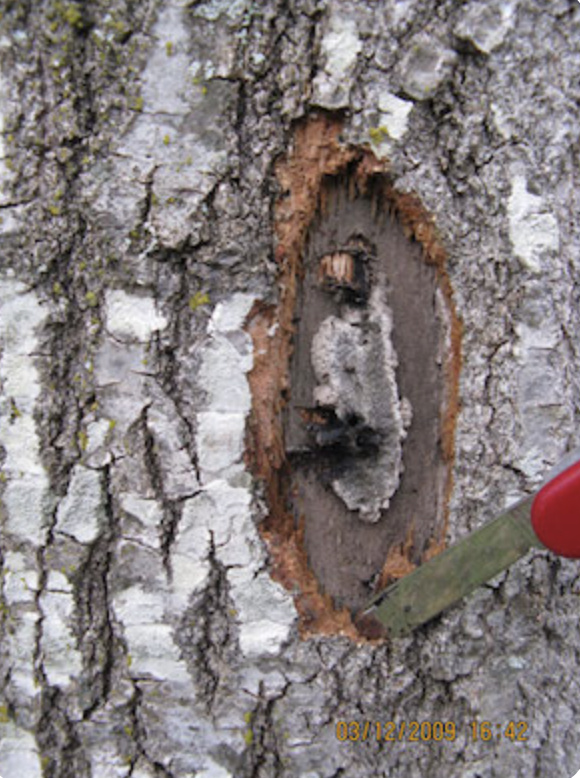 Sometimes, the fungus inside the tree makes a part of the bark pop out a little. This is called a fungal mat. If you see or smell something like this, it’s a big hint that the tree has oak wilt.